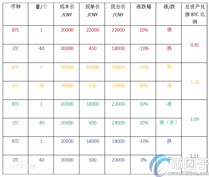 红色中表示BTC涨,LTC跌于我们总资产的变化情况,于20000CNY的成本价来讲,我们亏掉了2000CNY,因为BTC是涨10%,所以我们总资产也只能兑换0.81个比特币了。