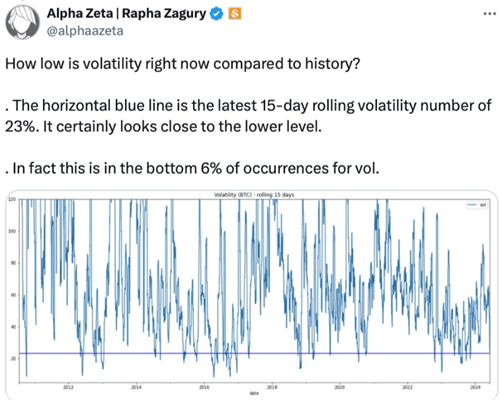 据Swan Bitcoin的首席投资官Rapha Zagury分析,从5月24日到6月7日这段时间内,比特币的波动率位列“最低6%的区间”。Zagury在6月7日的一篇帖子中指出:“最新的15天滚动波动率数值为23%,它确实已接近较低水平。”他进一步表示,比特币在这段时间内“仿佛被困在了一个狭窄的区间内”。