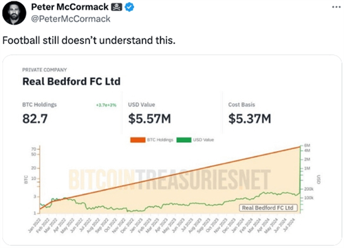 此次购买后,皇家贝德福德足球俱乐部持有的比特币总量达到了82.7枚,累计收购成本接近537万美元。目前,球队所持有的比特币平均成本价为每枚约64,925美元。值得注意的是,McCormack透露,其中15.8枚比特币已被指定用于足球相关的运营活动,显示出俱乐部不仅将比特币视为金融资产,更将其作为推动日常运营的重要工具。