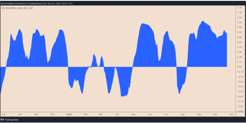 值得注意的是,比特币与纳斯达克综合指数和标准普尔500指数等高风险市场的40天相关性一直在0.69和0.75附近趋于平缓,低于一个月前的创纪录水平。另一方面,它与黄金的相关性从8月份的零飙升至10月份的0.67。