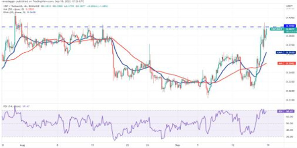 该货币对从 0.32 美元大幅上涨至 0.39 美元,表明多头的强劲买盘。20-EMA 已经出现,RSI 处于正区域,表明阻力最小的路径是上行。
