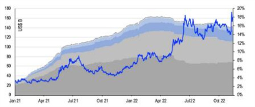 在 FTX于 11 月 11 日申请破产后,许多机构投资者的投资都停留在该平台上。FTX 的内爆也阻止了投资者和大买家远离加密生态系统。Coinbase 强调,稳定币的主导地位已达到 18% 的新高,这表明流动性危机可能至少会持续到年底。
