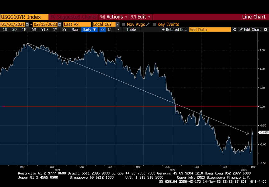 我预计,美联储要么会及早认识到这一结果,并在即将召开的 3 月会议上开始降息,要么一场严重的衰退将迫使他们在几个月后改变路线。自危机爆发以来,2 年期国债收益率已暴跌逾 100 个基点。市场正在尖叫着银行系统引发的通货紧缩,美联储最终会听进去的。